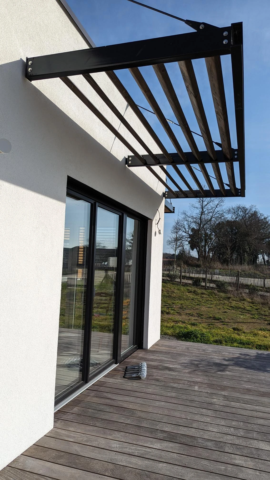 Brise soleil sur façade, dimensions 450*130cm : structure en acier galvanisé laqué noir