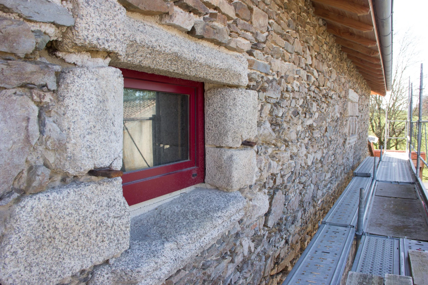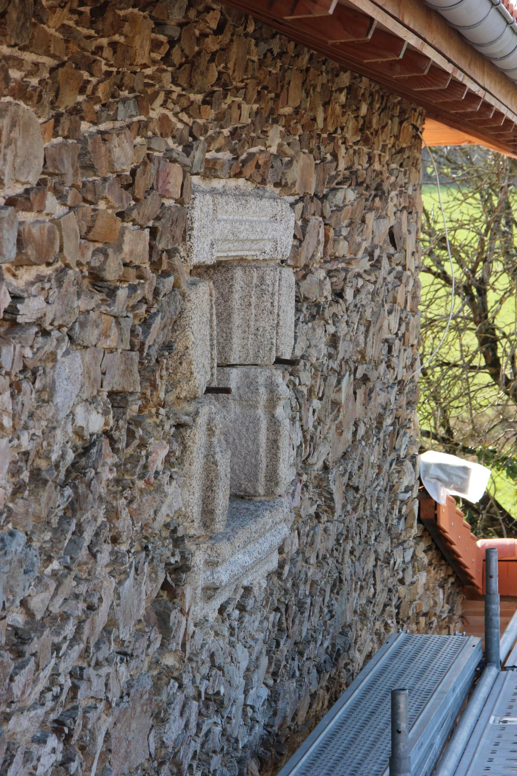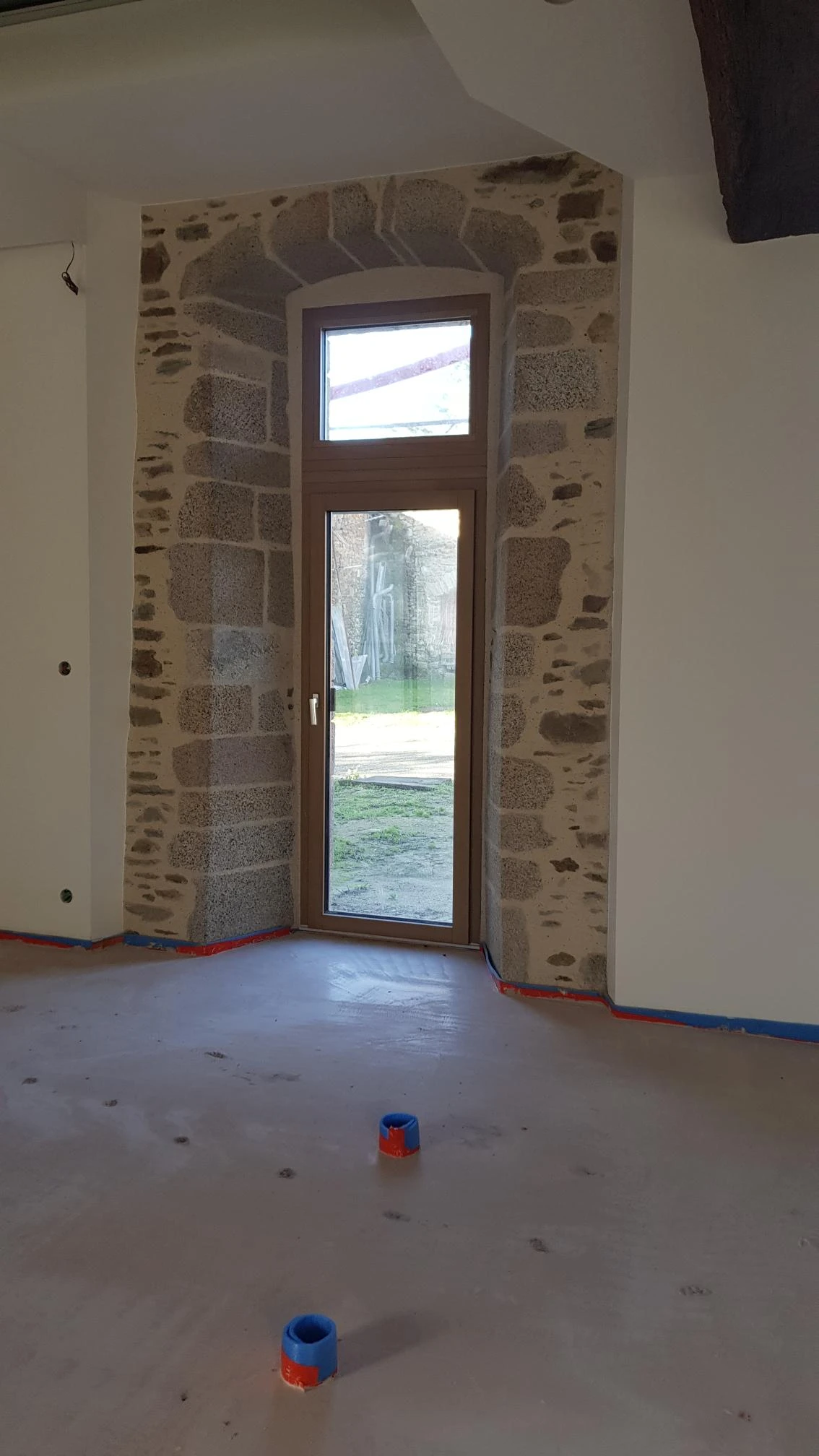 - Valorisation et rehausse de murs en pierres apparentes sur tout le bâti +mise en avant des détails architecturaux (cheminée, différentes niches, linteau et jambage en granit...) + création d'une dalle avec isolation des sols en Misapor 400 mm ( R=4,45m².K/W) + dalle en béton de chaux 150 mm (R=1,06)