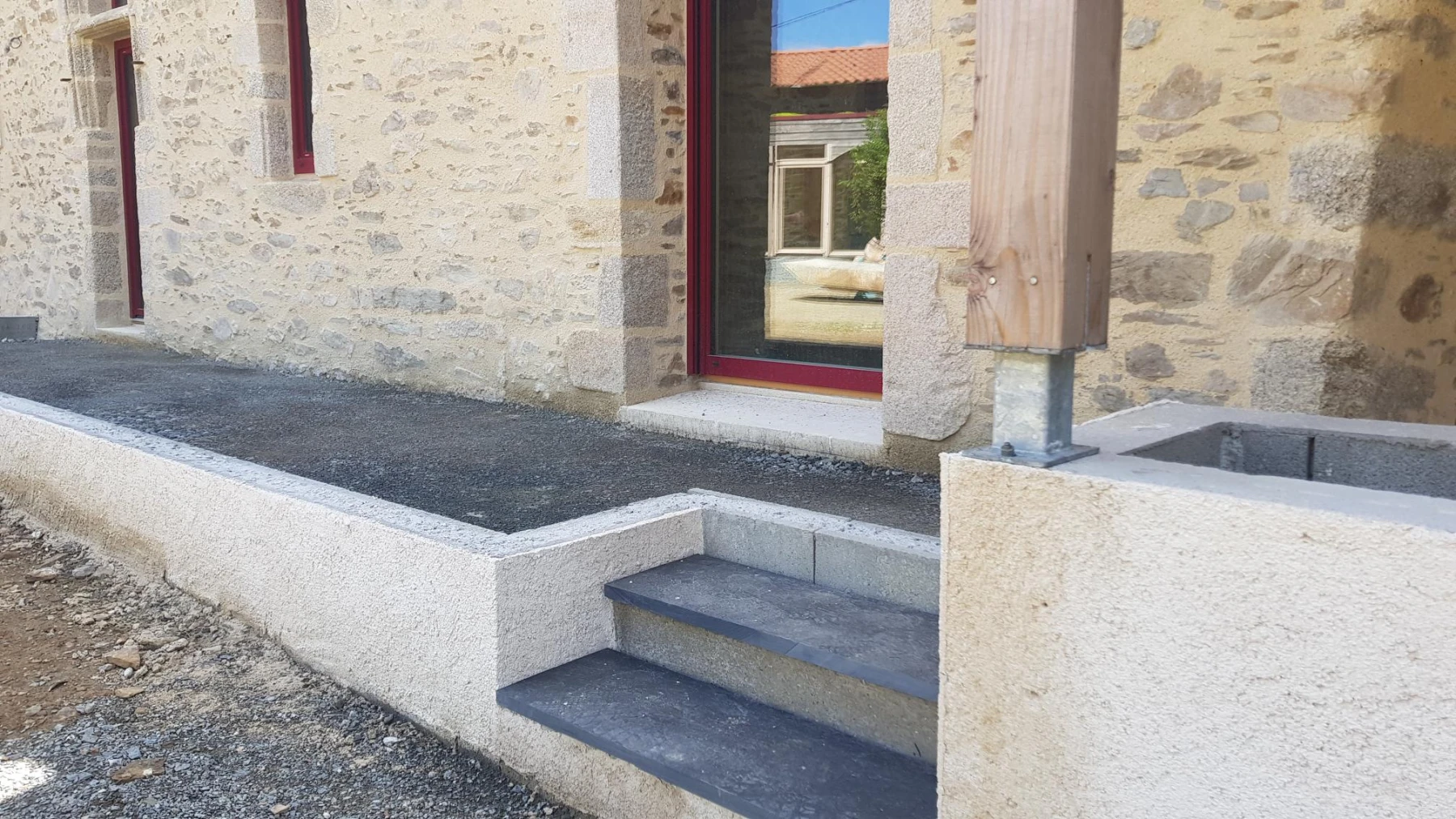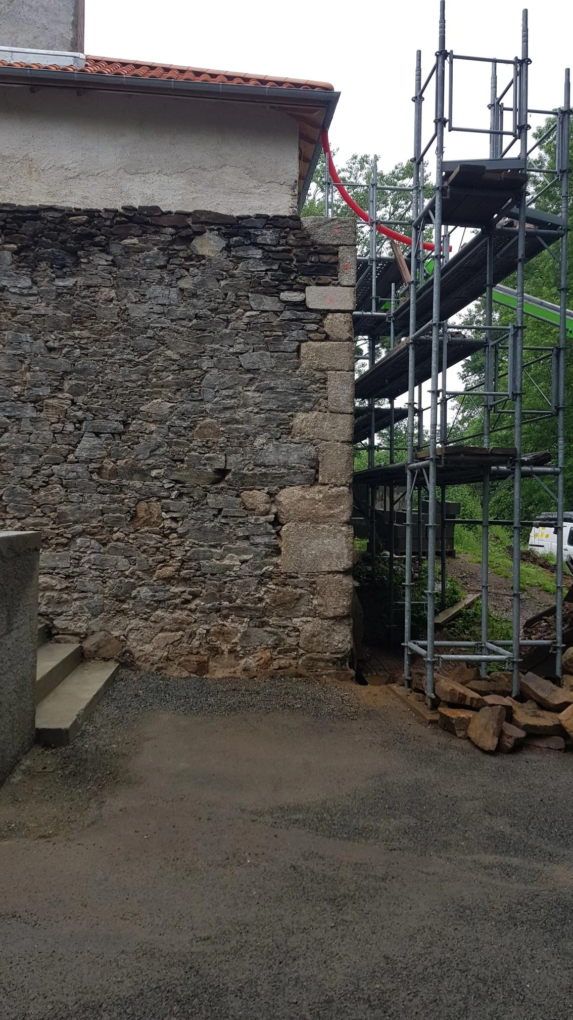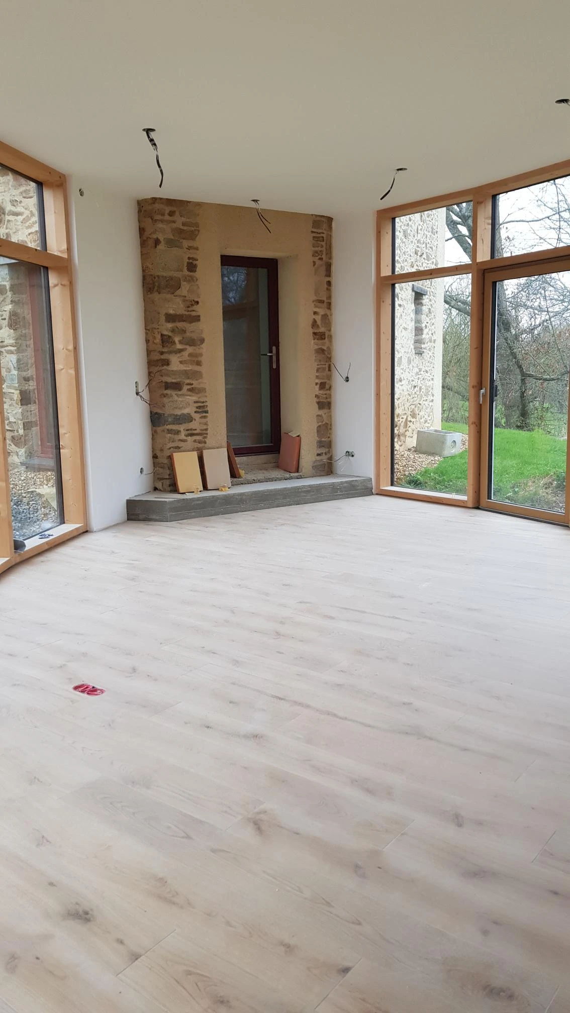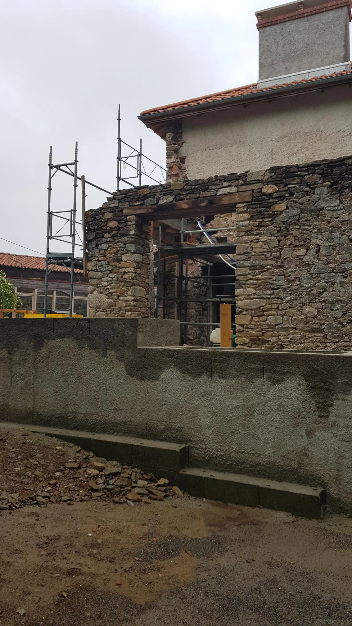 - Valorisation et rehausse de murs en pierres apparentes sur tout le bâti +mise en avant des détails architecturaux (cheminée, différentes niches, linteau et jambage en granit...) + création d'une dalle avec isolation des sols en Misapor 400 mm ( R=4,45m².K/W) + dalle en béton de chaux 150 mm (R=1,06)