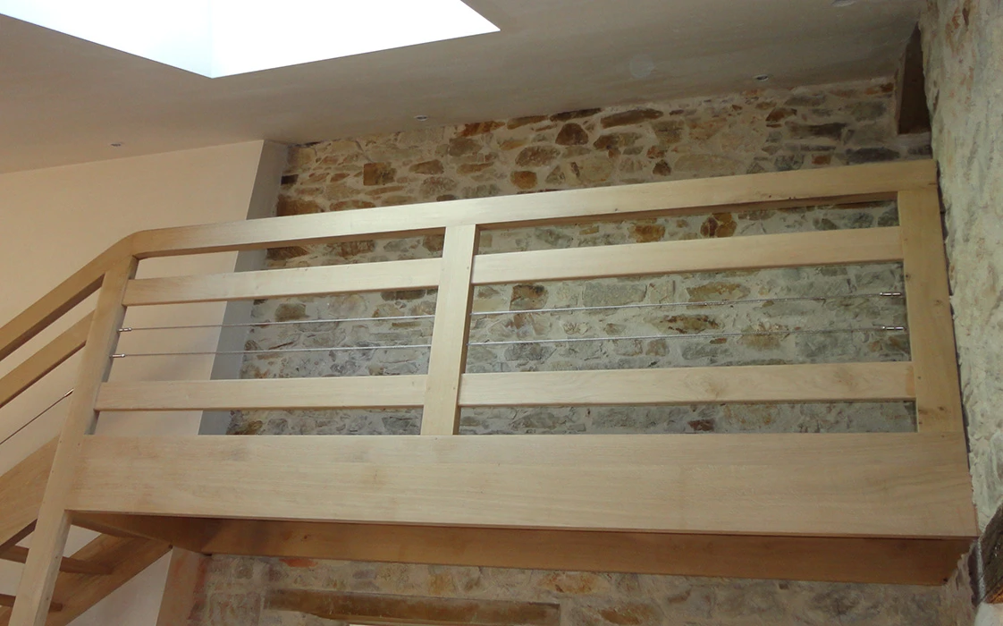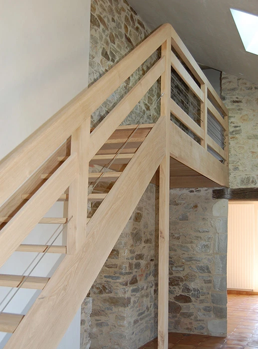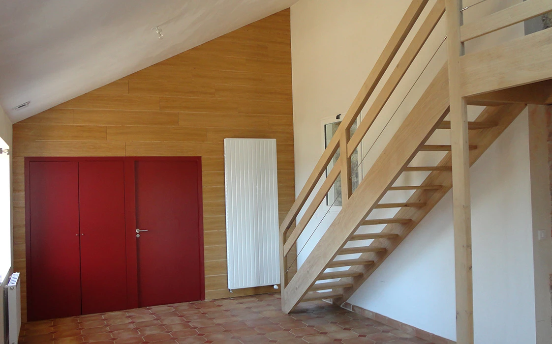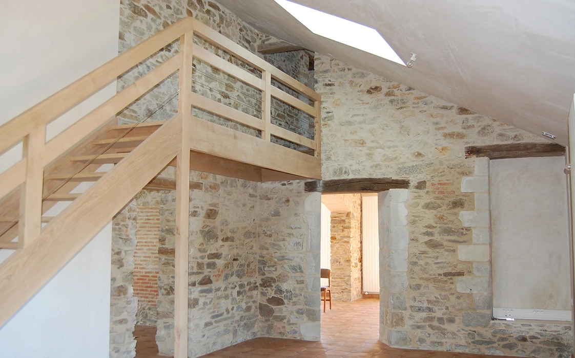 Crée une sensation confort et de bien-être. À l’intérieur la chaleur du bois, la terre cuite au rdc, le parquet en chêne à l’étage et le raffinement de béton ciré pour les salles de bain. L’escalier et la passerelle en chêne massif côtoient les murs en pierres apparentes que donnent du charme à la maison.