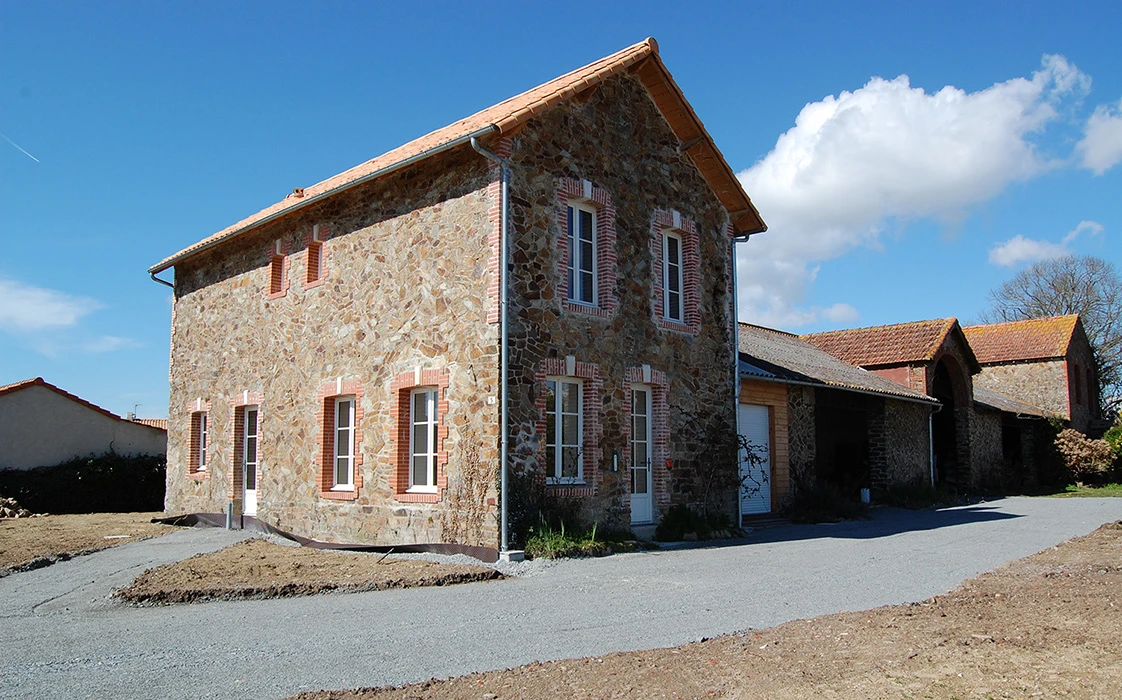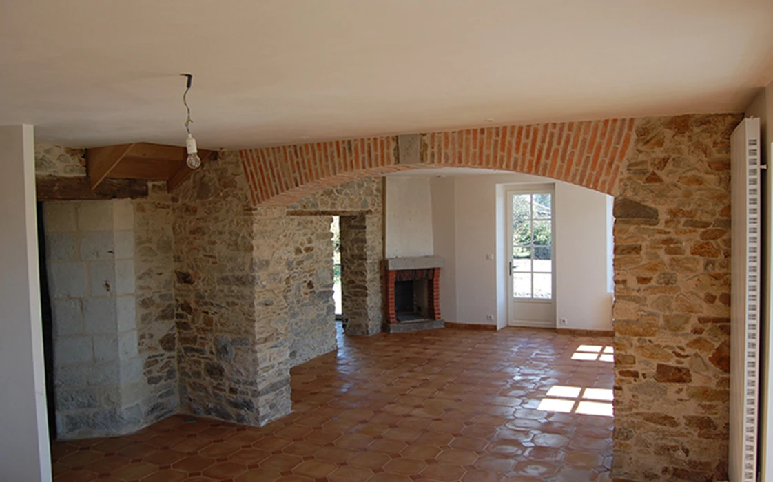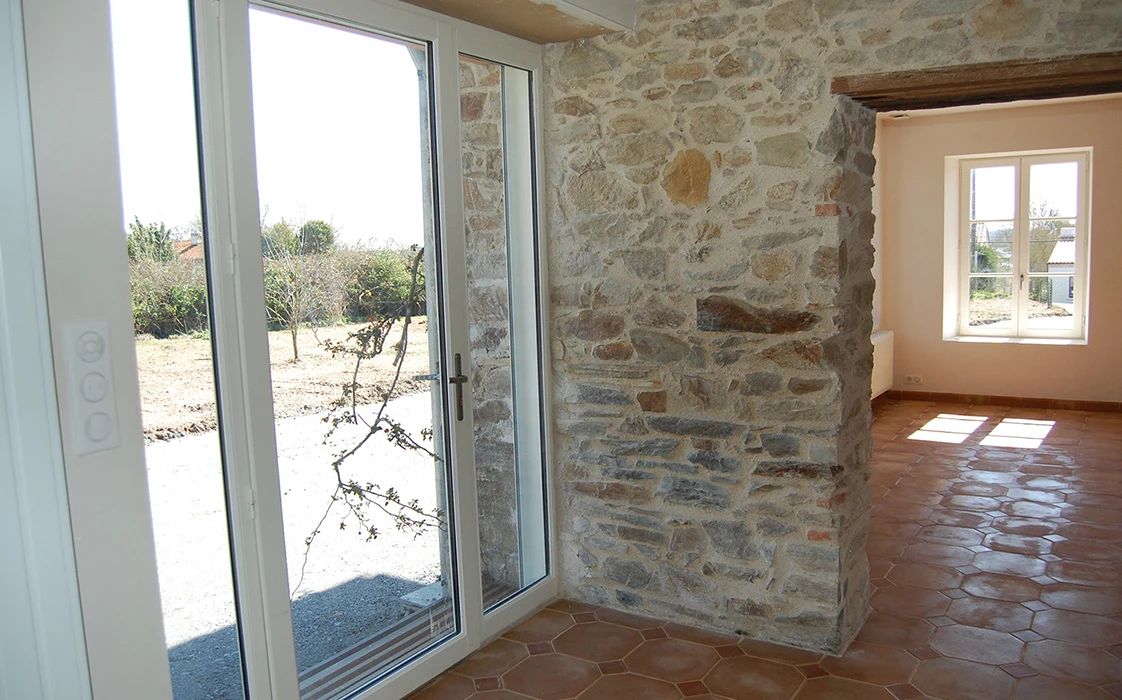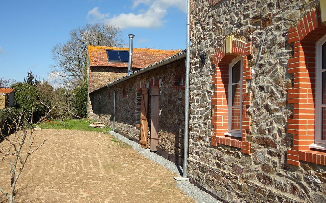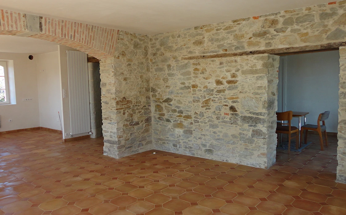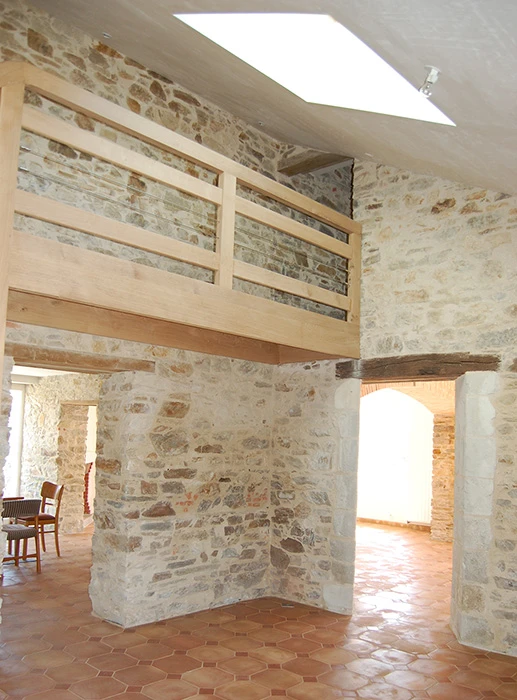La rénovation du site a commencé avec la partie sud de cet ensemble, l’architecte totalement en phase avec ses clients quant à la démarche dans le développement durable, crée des volumes simples, lumineux et spacieux. Pour cela, nombreuses ouvertures côté sud, ouvertures des murs en pierre pour optimiser l’organisation du foyer, pour résultat une maison rénovée, écologique, saine et économe en énergie.