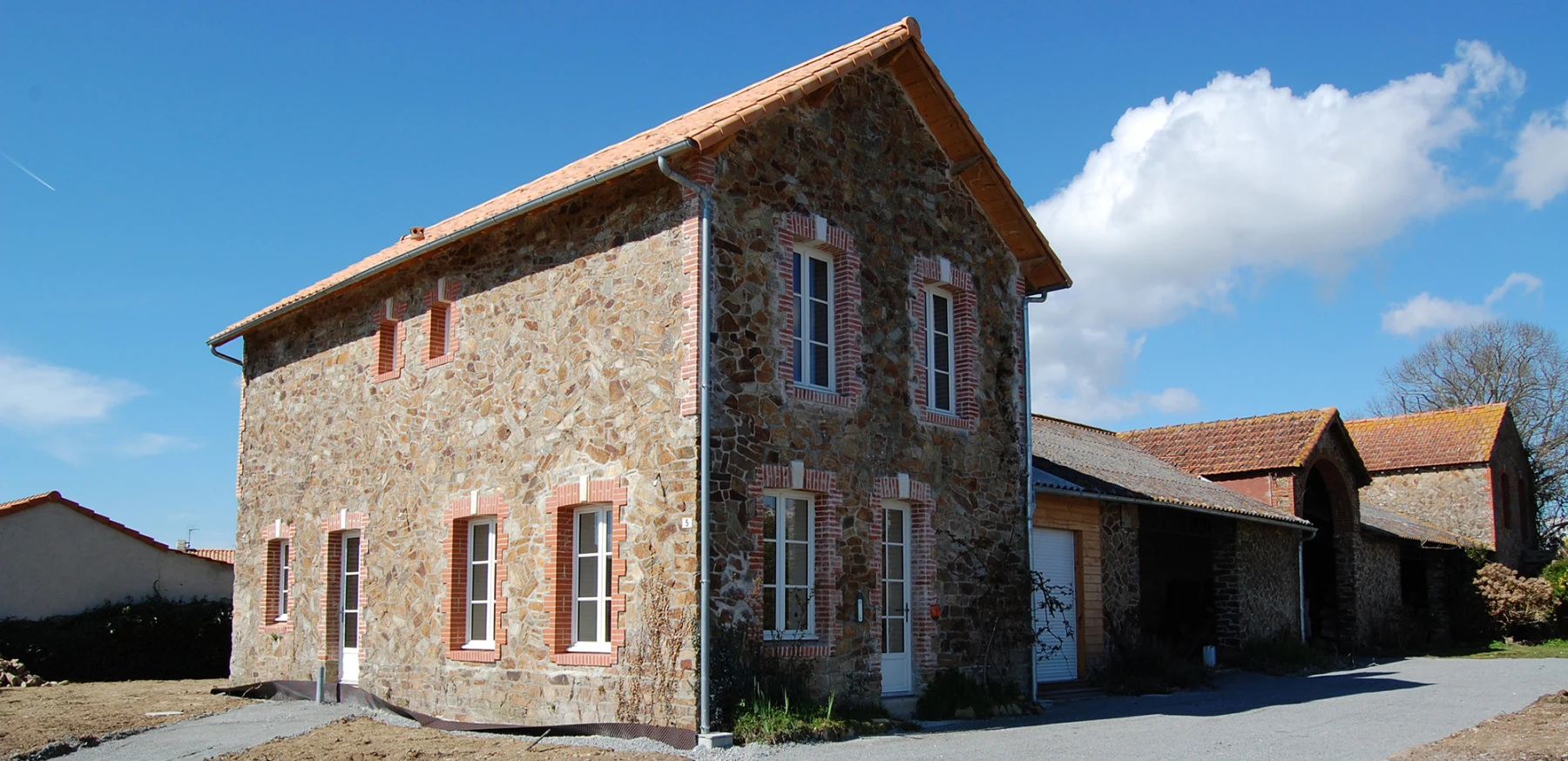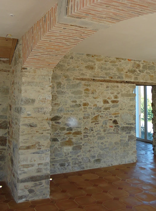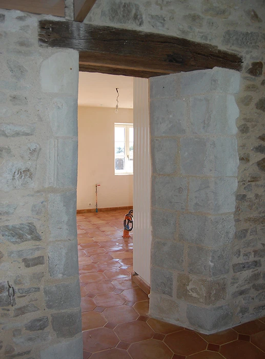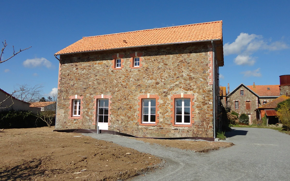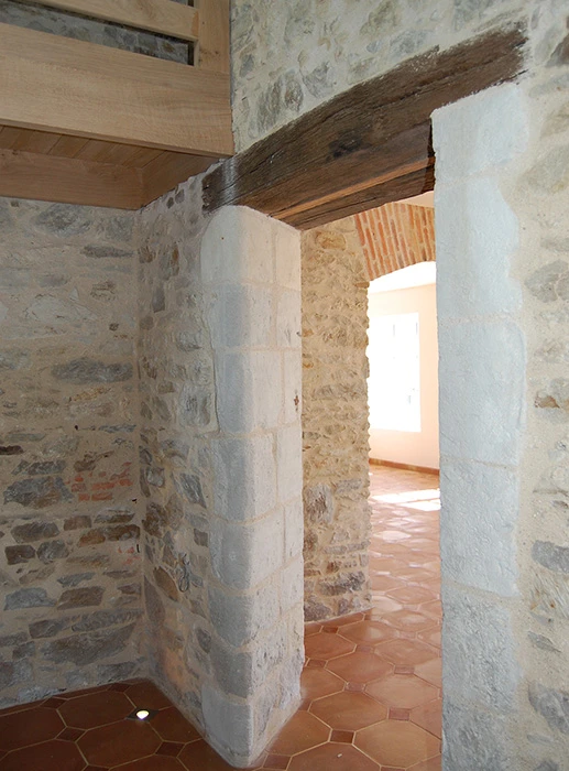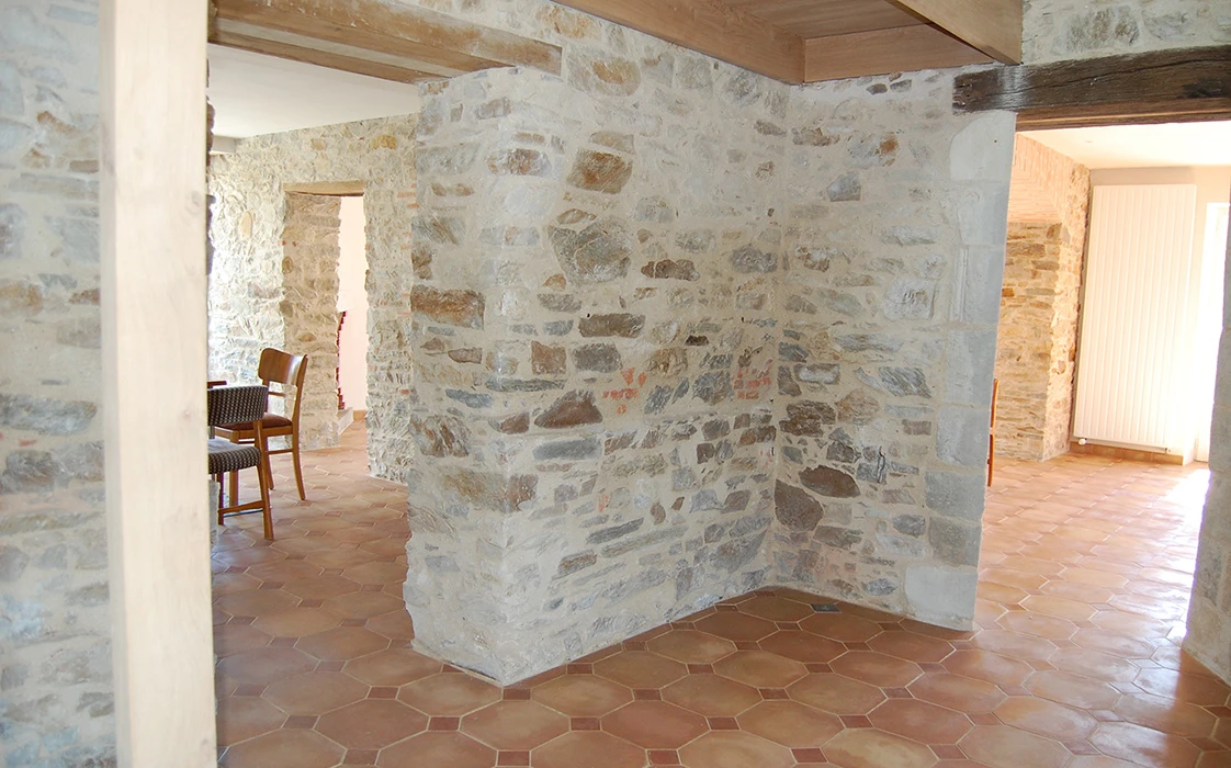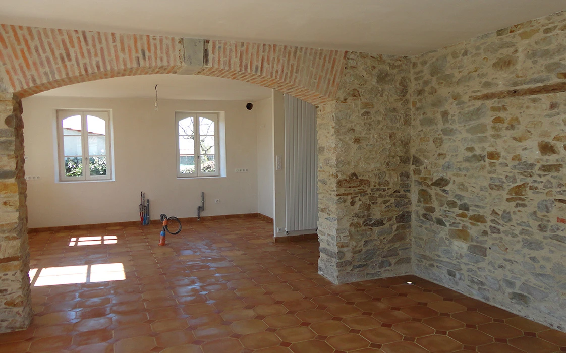 La rénovation du site a commencé avec la partie sud de cet ensemble, l’architecte totalement en phase avec ses clients quant à la démarche dans le développement durable, crée des volumes simples, lumineux et spacieux. Pour cela, nombreuses ouvertures côté sud, ouvertures des murs en pierre pour optimiser l’organisation du foyer, pour résultat une maison rénovée, écologique, saine et économe en énergie.