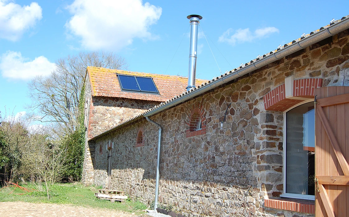 Pour le chauffage, la pose d’une chaudière à granulés Ökofen, une Pelletmatic Plus de 20 kW a été dimensionnée pour alimenter les deux maisons (côté nord et côté sud). Le local technique a été placé dans l’étable, ce qui permet la bonne distribution des différents réseaux. À l’intérieur, l’ancienne cheminée a été conservée pour l’esthétique.